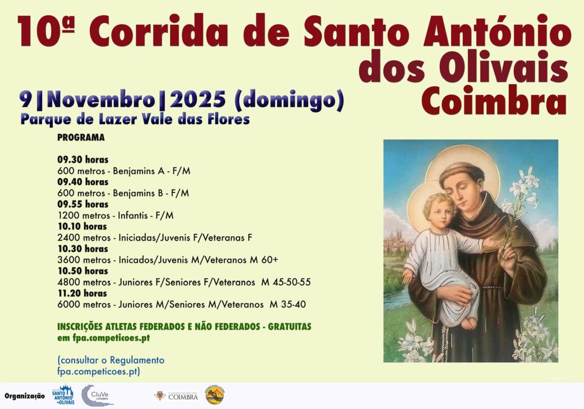 Com o apoio da Junta de Freguesia de Santo António dos Olivais, no dia 9 de Novembro, com início às 9h30, no Parque Linear do Vale das Flores, vai realizar-se a 10.ª Corrida de Santo António dos Olivais, organizada pelo CluVe.