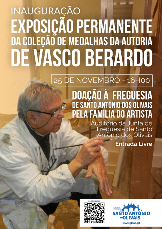 A Junta de Freguesia de Santo António dos Olivais manifesta publicamente o seu agradecimento à família do consagrado e reconhecido artista Vasco Berardo pelo ato generoso de doação à Freguesia da coleção de medalhas composta por cerca de 300 peças de inigualável valor. A referida coleção, cuja exposição é inaugurada no próximo dia 25 de Novembro, terça-feira, às 16H00, no Auditório da Junta de Freguesia de Santo António dos Olivais, ficando a integrar o património da Freguesia, pode ser visitada, de segunda a sexta-feira, das 10H00 às 12H30, e das 14H30 às 17H00.